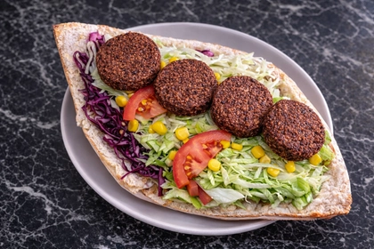 smažené placičky cizrny, zeleninový salát a omáčka v tureckém chlebu