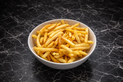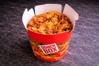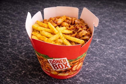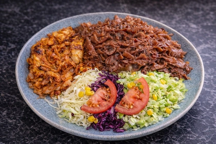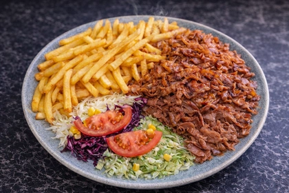 maso, zeleninový salát, hranolky, turecký chléb a omáčka