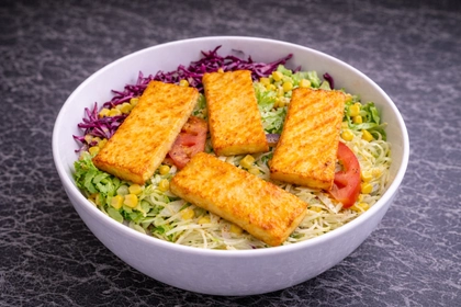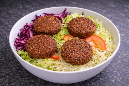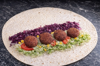 smažené placičky cizrny, zeleninový salát a omáčka v tortile