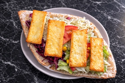 sýr halloumi, zeleninový salát a omáčka v tureckém chlebu
