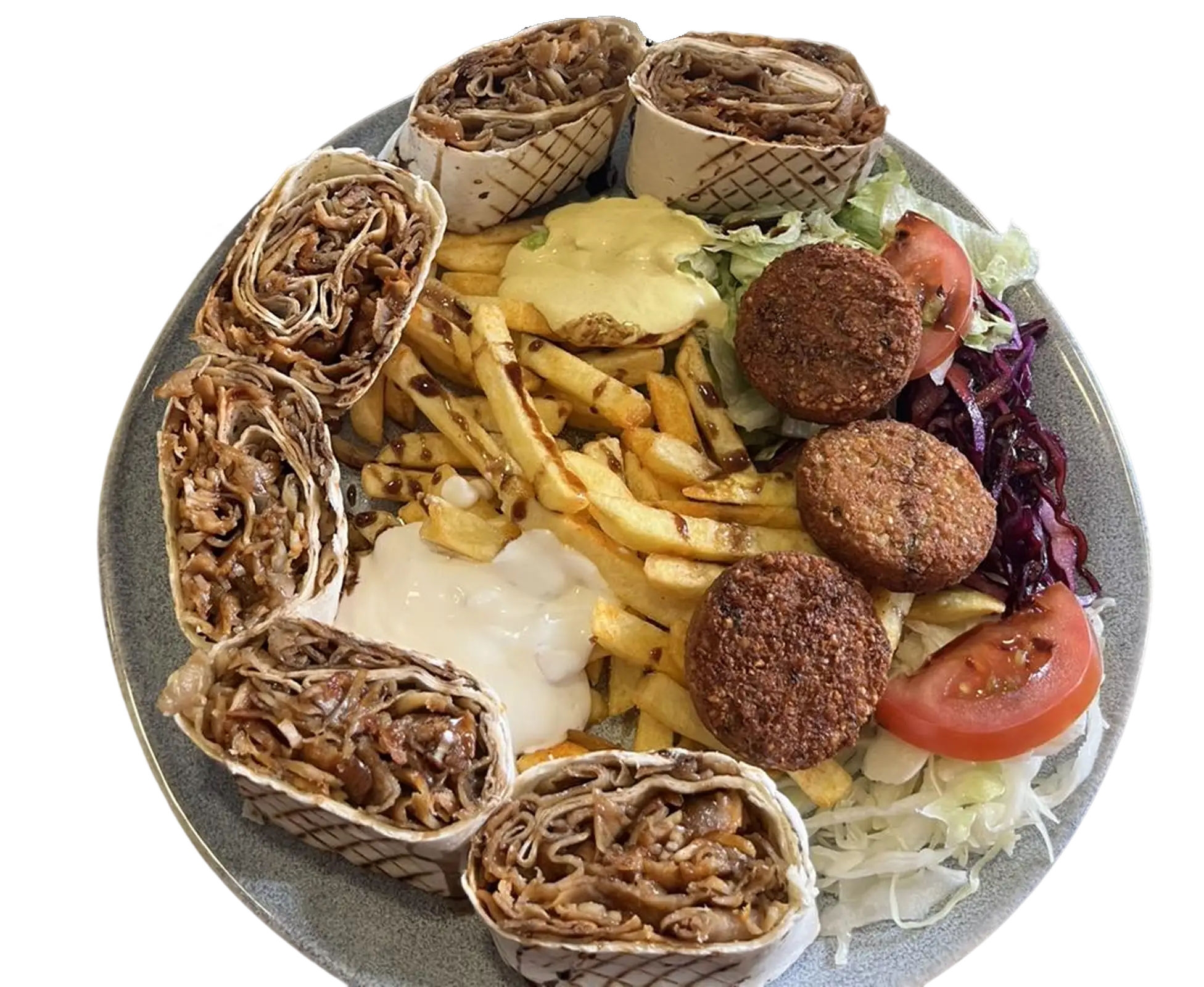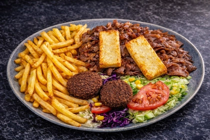 maso, sýr halloumi, falafel, zeleninový salát, hranolky, turecký chléb a omáčka